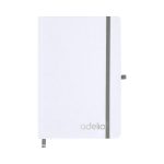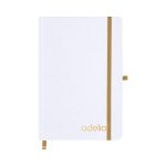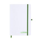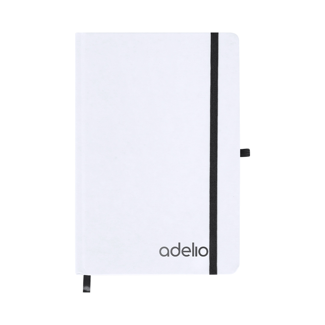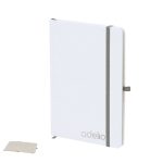 Notepad con copertine rigide bianche fatte di cartone riciclato. Interno con 80 fogli disponibili per una striscia. Include segnalibro, dello stesso colore del nastro elastico e del portapenne. Speciale per l’incisione laser che mostra il colore selezionato.