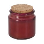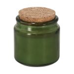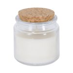 Candela profumata alla vaniglia in barattolo di vetro trasparente, circolare e con coperchio di sughero.