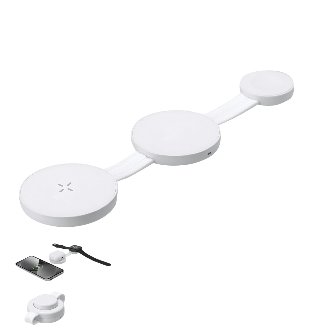 Caricatore wireless magnetico da 15W da 3 in 1, realizzato in ABS. Progettato per la ricarica simultanea di smartphone, cuffie e smartwatch, ed è ultra-compatto per dimensioni. Un gadget tutto-in-uno: pieghevole, portatile, altamente versatile e progettato funzionalmente. Connessione USB di tipo C -cavo incluso-.