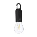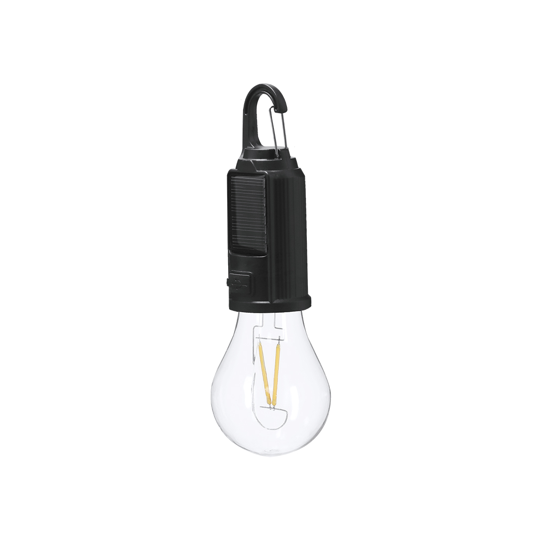Lampada con design originale della lampadina e corpo in ABS. Batteria da 300 mAh e ricarica solare. Ha un sensore notturno che si attiva automaticamente quando non riceve la luce solare. Dispone di carica tramite cavo di tipo C, oltre a includere un moschettone per un facile trasporto.