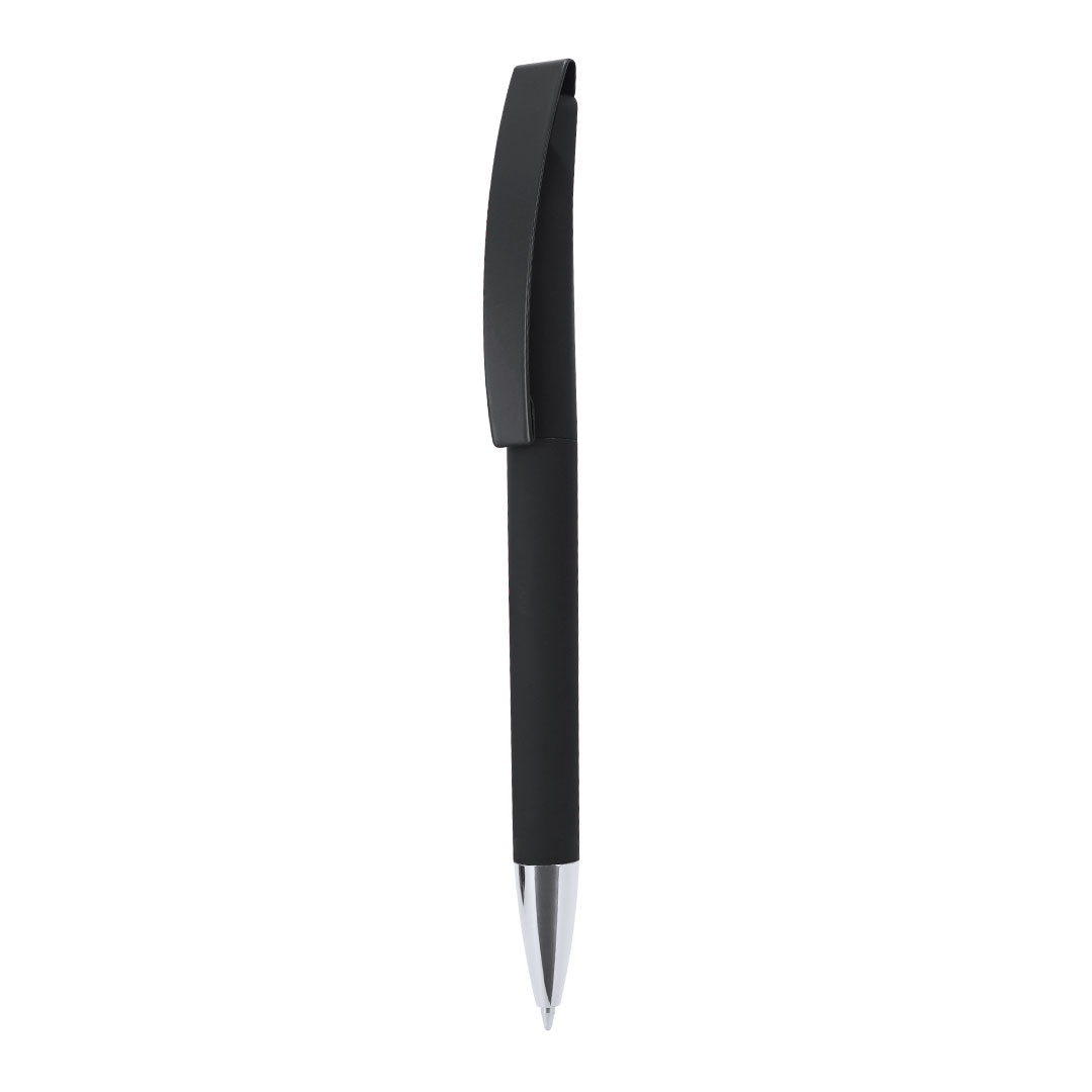 Penna a meccanismo a pulsante. Punta con finitura metallica. Corpo rifinito in gomma, clip appositamente progettata per la marcatura laser con effetto specchio. Con inchiostro blu.