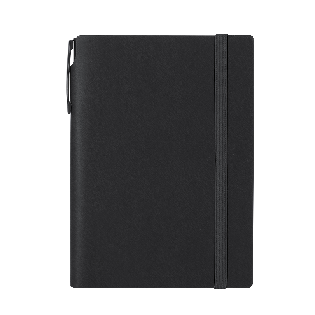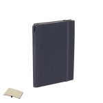 Un blocco note e una penna fatti di PU riciclato e alluminio riciclato. Il set comprende: – Bloccuini per note realizzato in PU riciclata. Copertine rigide, comprende 96 pagine color crema, segnalibro e nastro elastico abbinato per chiusura. Con il logo in PU riciclato. – Penna in alluminio riciclato, con corpo di colore uniforme in finitura in gomma. Ha una pinza, un meccanismo a pulsante e inchiostro blu. Include il badge del logo in alluminio riciclato.Il blocco ha uno spazio per conservare la penna così puoi portare tutto in un unico posto.