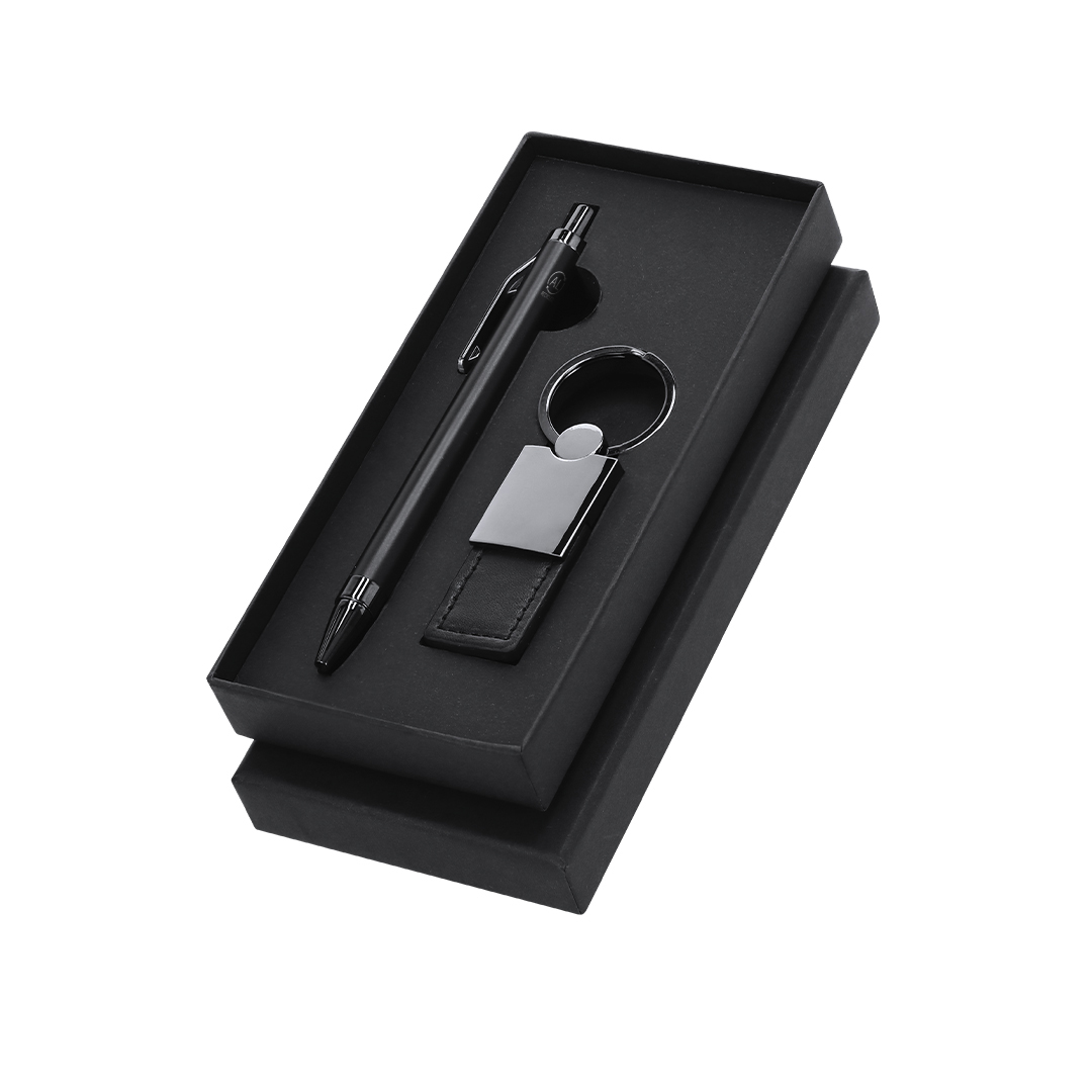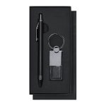 Elegante set premium che include: Penna in alluminio riciclato con finitura nera opaca, meccanismo a pulsante e inchiostro blu. Con clip e punta lucidata in ABS. Include il distintivo Recycled Aluminum Elegante portachiavi con nastro realizzato in PU, poliestere e accessori cromati.