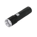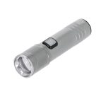 Torcia fatta di alluminio riciclato con finitura opaca e zoom estesibile. Con una luce COB a tre posizioni, alimentata da una batteria da 800mAh, includeva un cavo di ricarica Tipo C da 5V. Con il pulsante on/off sul lato e elementi decorativi cromati.