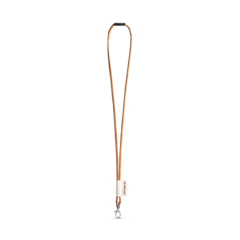 Lanyard personalizzato in sughero. Completa Lanyard Cork Long con i seguenti accessori ed extra: etichetta 43x15 mm in cotone, moschettone di 9 mm e chiusura di sicurezza. Prodotto in Europa. I prezzi indicati includono la personalizzazione della serigrafia a 1 colore/1 posizione